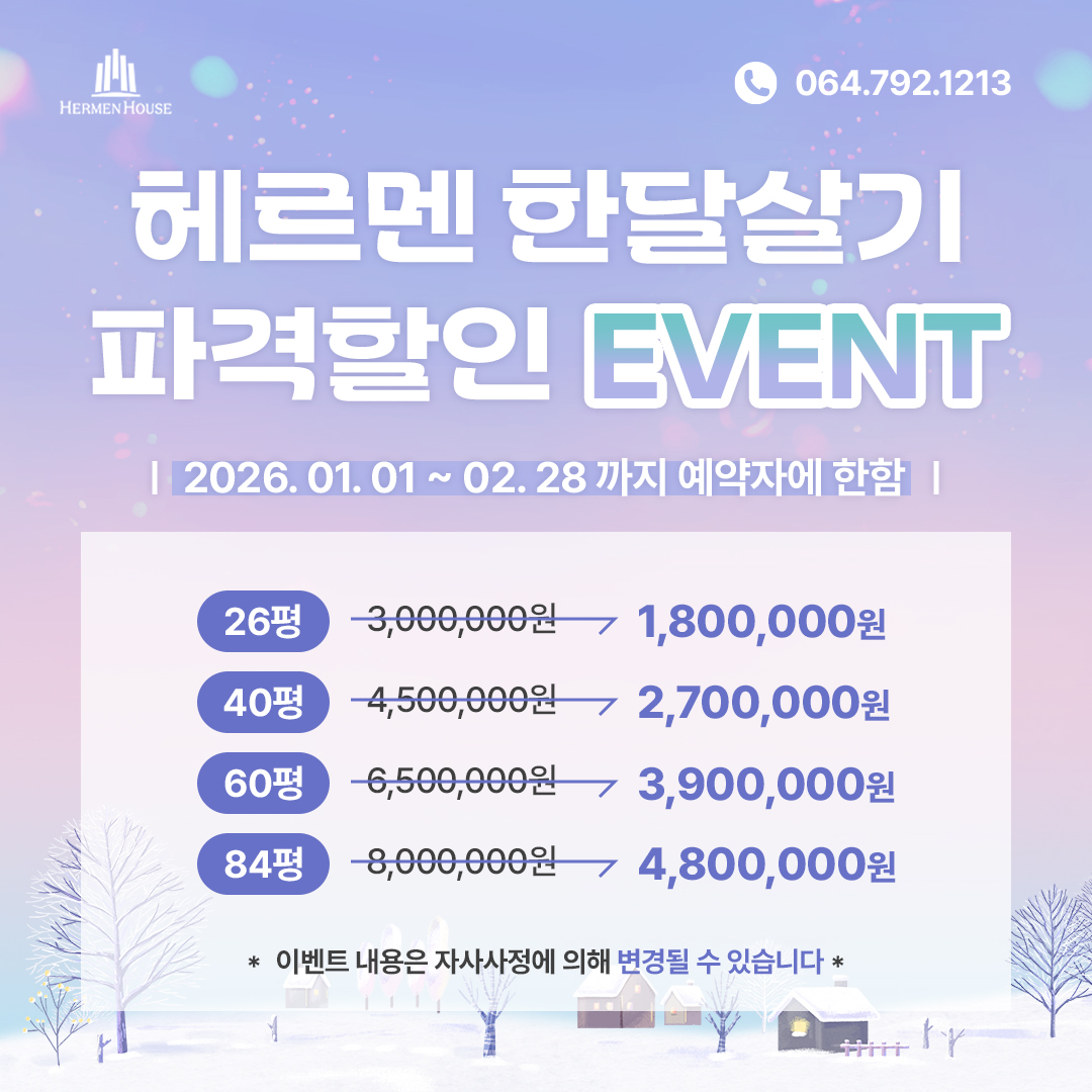 2026년 헤르멘 한달살기 1, 2월 파격 할인 이벤트 2026.01.21 | 관리자